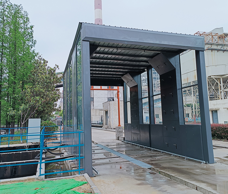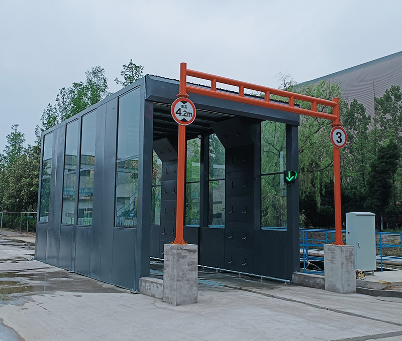 2、車輛緩慢向前移動,進入循環水沖洗平臺區域,高壓水噴嘴對車輛輪胎、底盤、兩側、進行徹底清洗。沖洗時間一般40~120s,根據實際沖洗效果控制車輛行駛速度來控制沖洗時間。